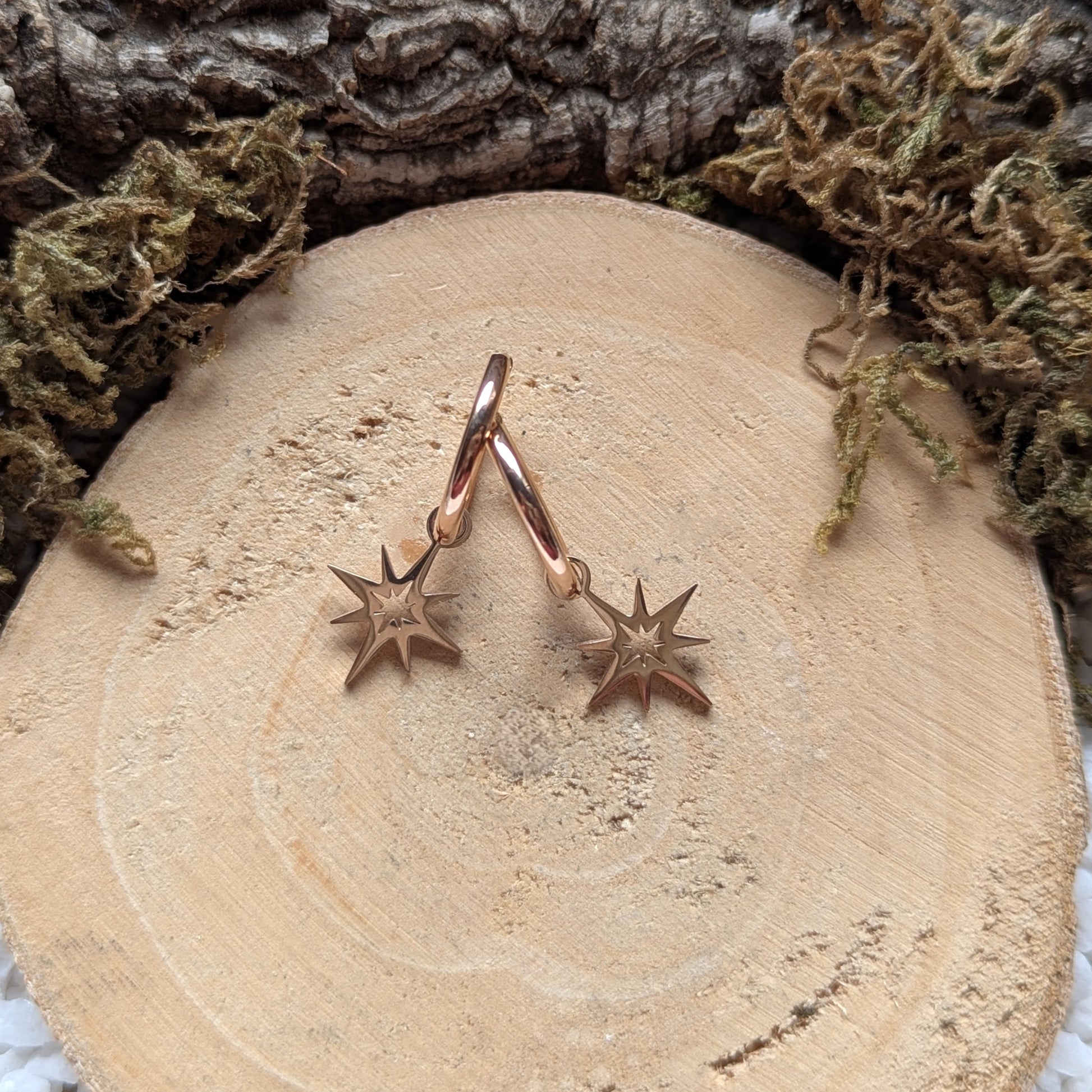 Diese roségoldfarbenen Klappcreolen aus Edelstahl verdanken ihren Namen den kleinen Stern Anhängern.